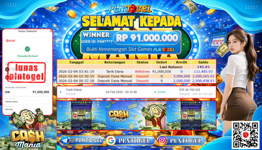 BUKTI JACKPOT SLOT GAME 4 Februari 2026 Posted by ADMIN PLNTOGEL CASH MANIA RABU, 04 FEBRUARY 2026 RP 91,000,000,- SELAMAT KEPADA PEMENANG, SALAM JP Updated: 4 Februari 2026 at 06:10 ◀ PREDIKSI JITU SINGAPORE POOLS BUKTI JACKPOT SLOT GAME ▶