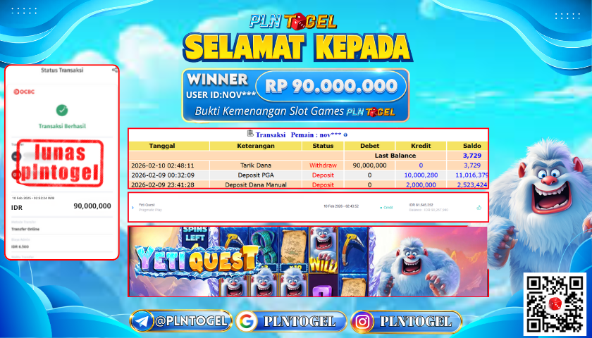 BUKTI JACKPOT SLOT GAME 10 Februari 2026 Posted by ADMIN PLNTOGEL YETI QUEST SELASA, 10 FEBRUARY 2026 RP 90,000,000,- SELAMAT KEPADA PEMENANG, SALAM JP Updated: 10 Februari 2026 at 02:58 ◀ BUKTI JACKPOT SLOT GAME PREDIKSI JITU PCSO POOLS ▶
