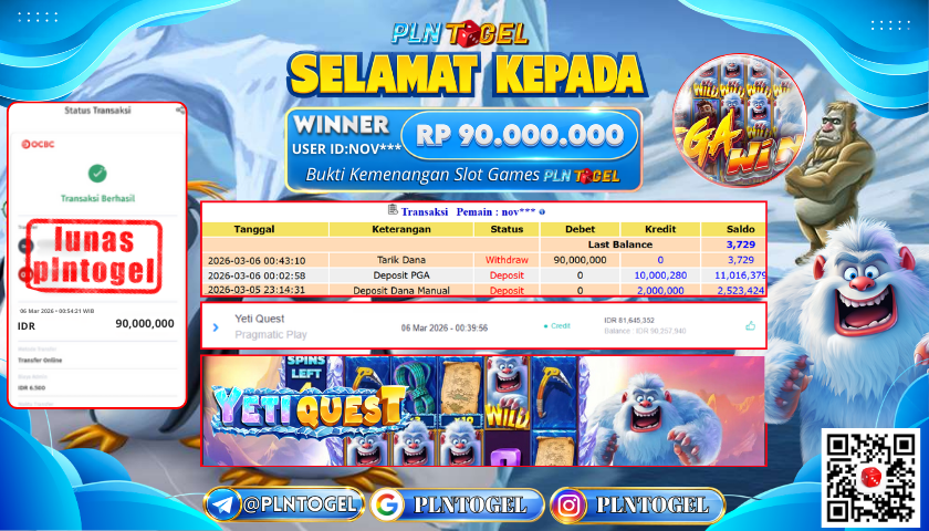 BUKTI JACKPOT SLOT GAME 6 Maret 2026 Posted by Admin Plntogel YETI QUEST JUMAT, 06 MARET 2026 RP 90.000.000,- SELAMAT KEPADA PEMENANG, SALAM JP! Updated: 6 Maret 2026 at 02:35 ◀ PREDIKSI JITU CAMBODIA POOLS BUKTI JACKPOT SLOT GAME ▶