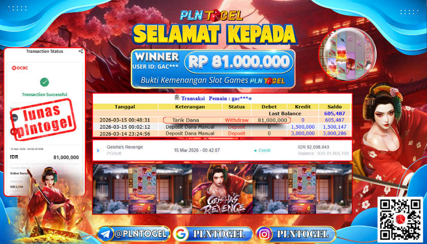 BUKTI JACKPOT SLOT GAME 15 Maret 2026 Posted by Admin Plntogel GEISHA’S REVENGE MINGGU, 15 MARET 2026 RP 81.000.000,- SELAMAT KEPADA PEMENANG, SALAM JP! Updated: 15 Maret 2026 at 01:29 ◀ BUKTI JACKPOT SLOT GAME PREDIKSI JITU PCSO POOLS ▶